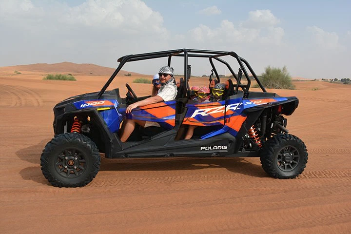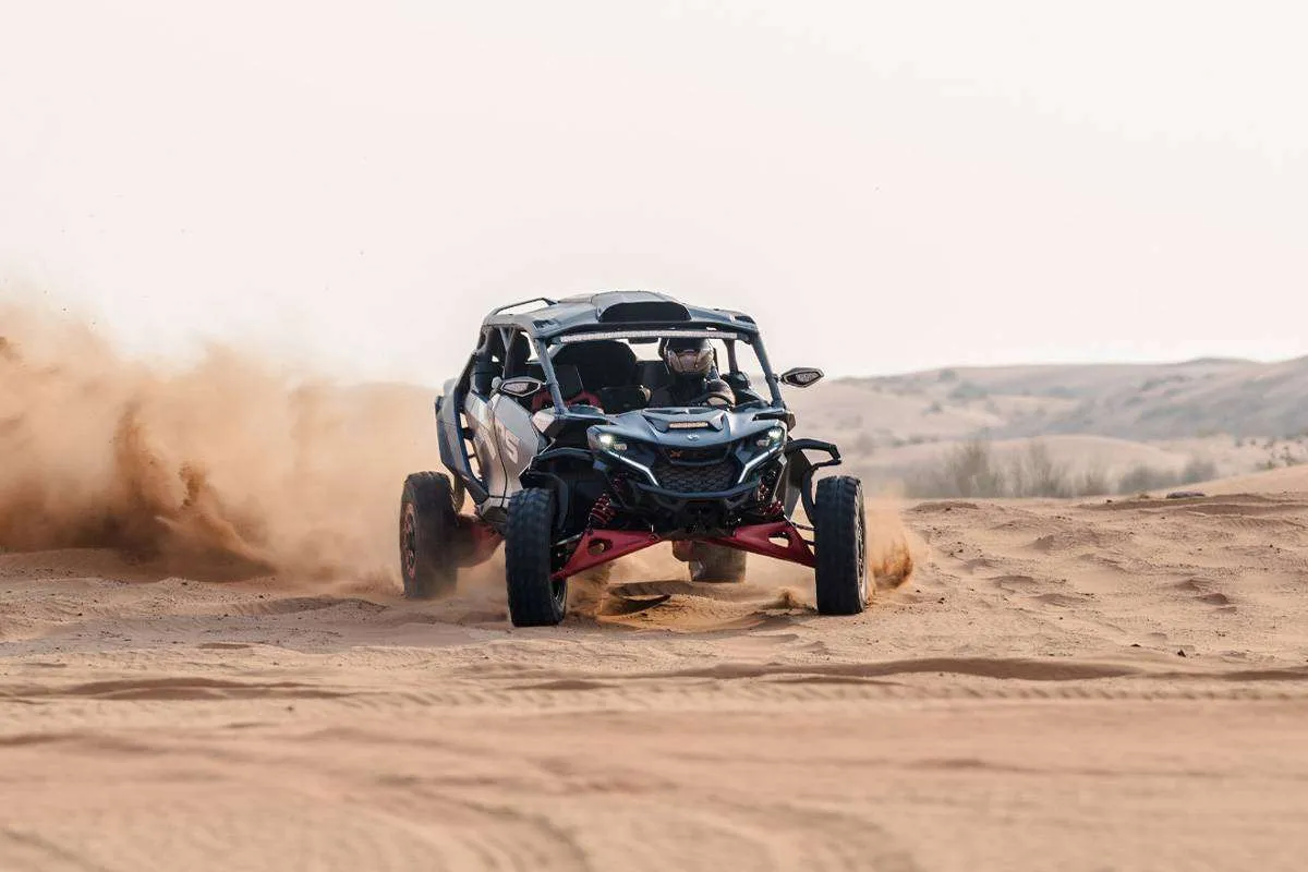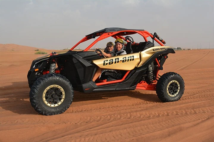 Our dune buggy tours in Dubai are fully customizable to match your needs. Whether you choose a 2-seater buggy for couples or a 4-seater buggy for families and groups, our modern fleet delivers both excitement and reliability. We use advanced dune buggies such as Can-Am Maverick R X RS 25, Kawasaki buggies, and Polaris RZR models, all maintained to high safety and performance standards.